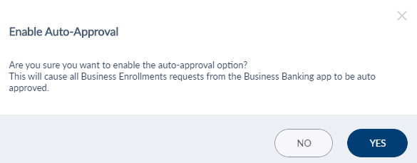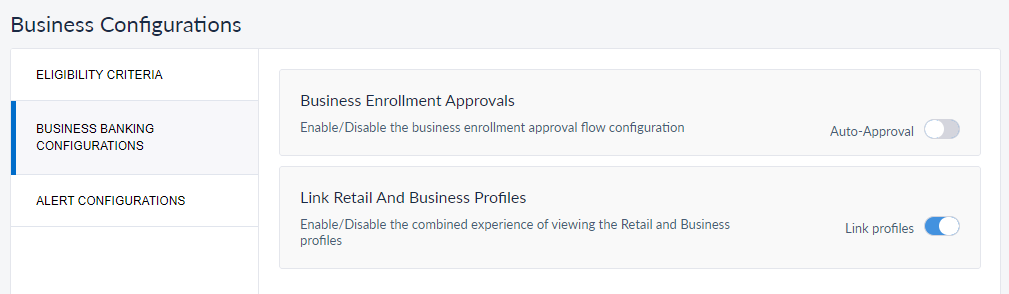 - Business Enrollment Approvals - You can enable or disable this configuration from here. If you enable this configuration, all the business enrollment requests received from the Online Banking application are approved automatically.