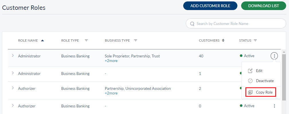 NOTE: If you copy a role associated with Business Banking, that business types are copied but default role settings are not copied. This is so that the default setting will not be overridden by new roles when you copy a role.