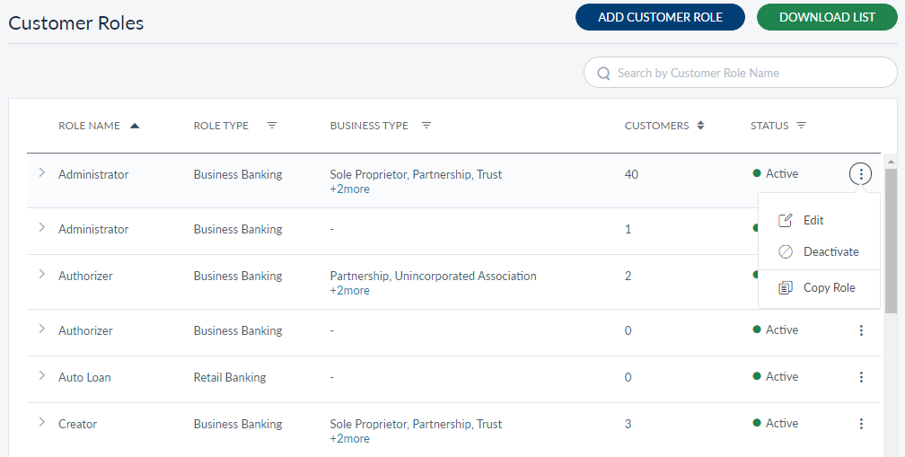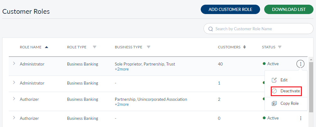 available on each row and update the status based on the current status of the customer role. The following statuses are available: Activate and Deactivate. For example, if the current status of a role is Active, you can Deactivate the role or vice versa.