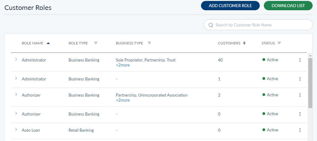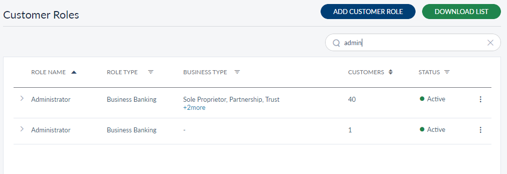 denotes sorted by that column). You can also filter the list by Role type (Business Banking or Retail Banking), Business Type and Status (active or inactive).