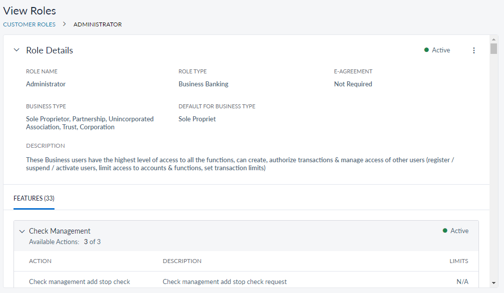 - Servcies - If the Role Type is Business Banking, then this section displays the associated Business Type(s) to which this role is applicable.