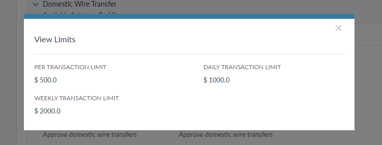 - The Limits tab that displays the transactional features and actions with their respective Per Transaction, Daily Transaction and Weekly Transaction limits.