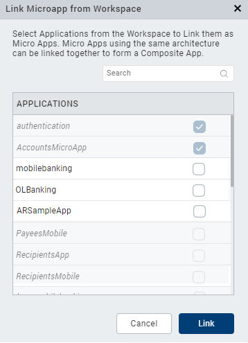 The Link Micro App dialog box appears. - From the list of available applications, select the micro apps that you want to link to the project.