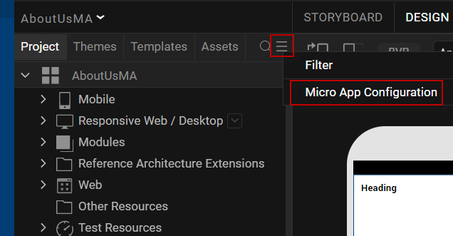 - In the Project Explorer, from the hamburger menu, click Micro App Configuration.