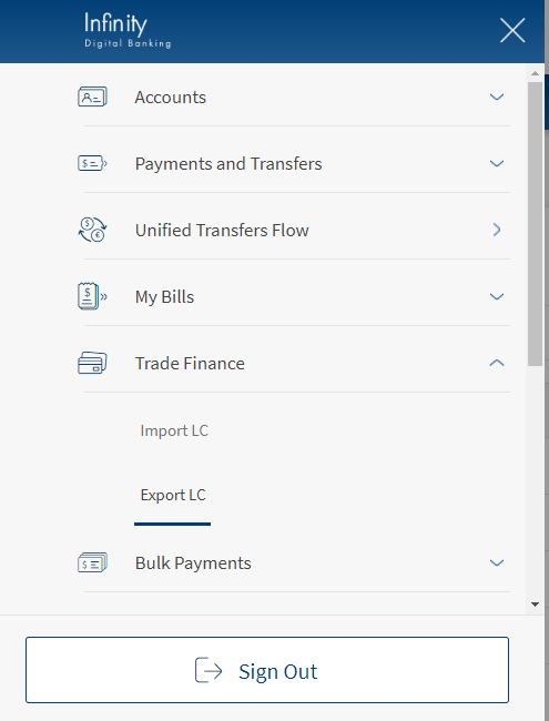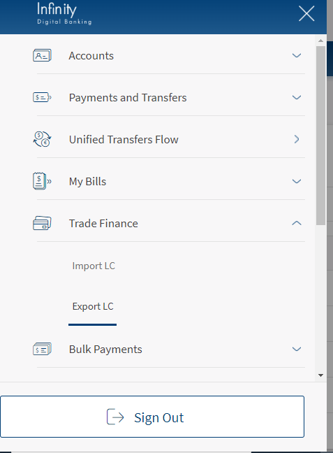 - Navigate to Web Channel > Trade Finance > Export LC. This opens the Export Letters of Credit summary page.