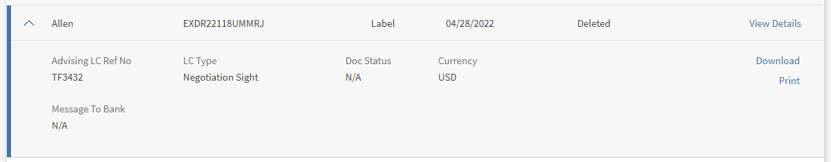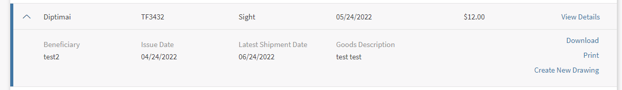 - On the desired Export Drawing record, click View Details. This will navigate to Export Drawing LC records page viewing the details.