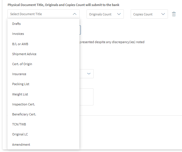 Note: Only selected files are allowed to upload, and the file size is not more than 20 MB. - In Physical Document Title, Original and Copies Count will Submit to the bank section, add the details Title and the total number of copies accordingly.