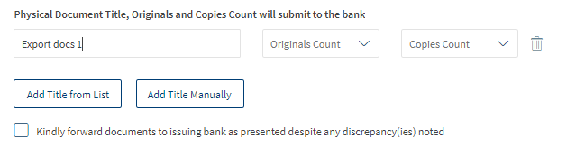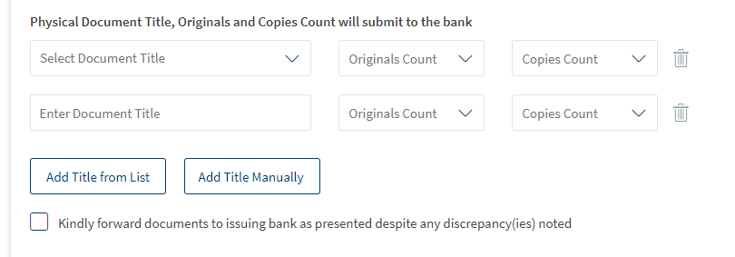 - User can check "Kindly forwards documents to issuing bank as presented despite any discrepancy(ies) notes" based on his decision.
