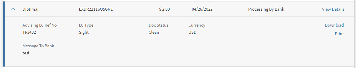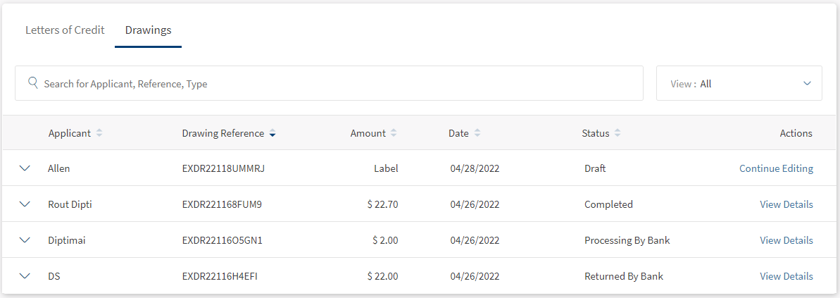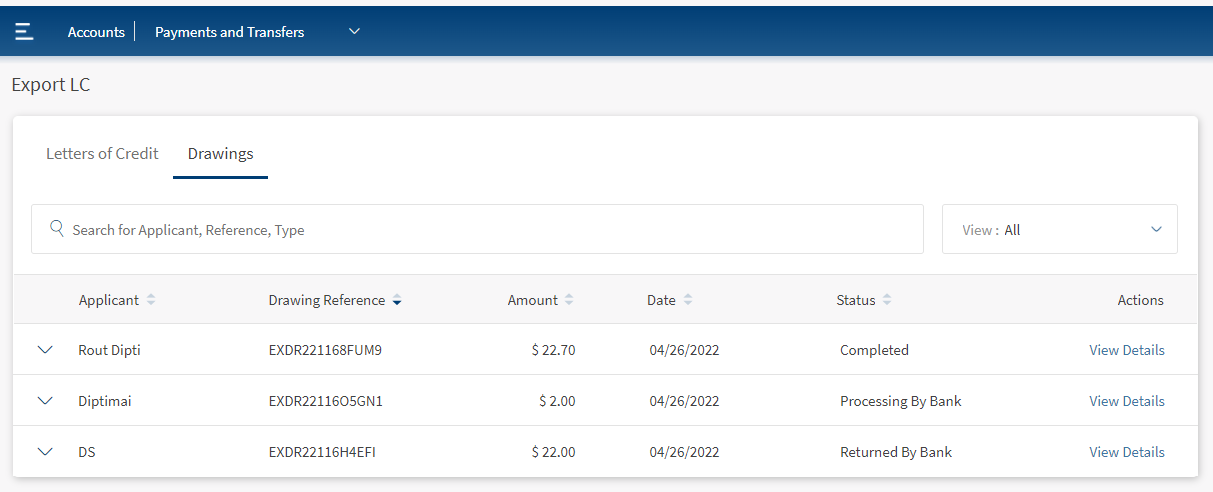 Users can either view the single Export Drawings record or view all the Export Drawings created for the single Export LC record. There is also an option to view Details for the status "Processing by Bank" and "Completed" status.