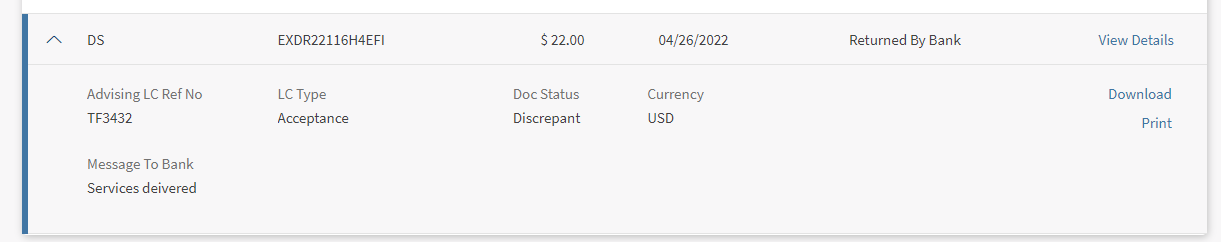 The bank user sees the Export Drawing details for the status Returned by Bank. In addition to the View Export Details, the bank user can see Discrepancies Returned by Bank and Response to the Discrepancies. At the right side of the Discrepancies Returned by Bank user can see View Returned by Bank History, by clicking this user can see the history of discrepancies for the current Export LC.![]()