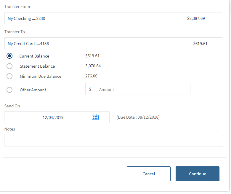 • Current Balance. Select this option to transfer current balance amount to the credit card from the selected account.