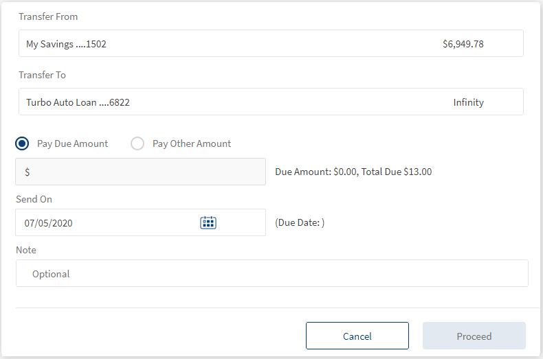 • When the transfer to a loan is initiated, the next due amount is pre-filled in the "Amount" field. You cannot modify the due amount.