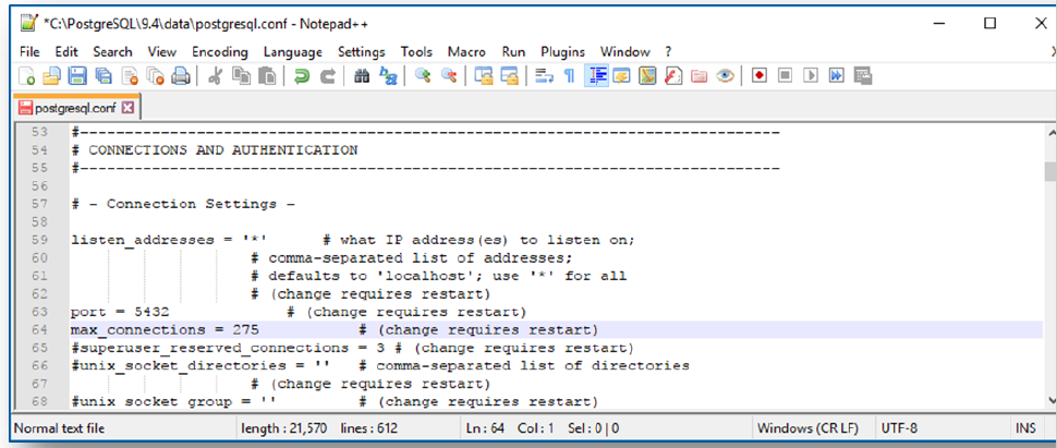 - Right-click postgresql.conf » Edit with Notepad++.