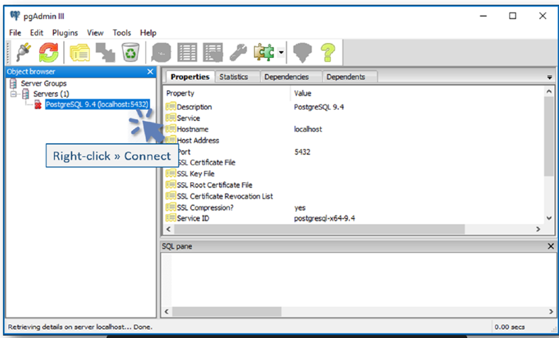 - Right-click postgresql-x64-9.4 Windows Service > Restart.