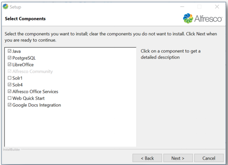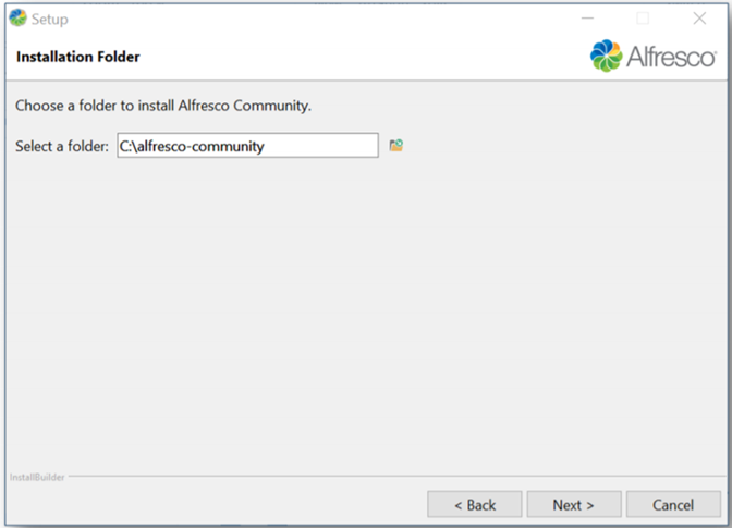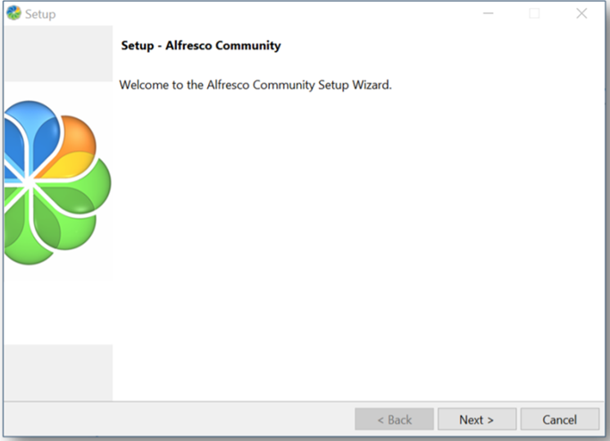 - Welcome: Displays “Welcome to the Alfresco Community Setup Wizard”.