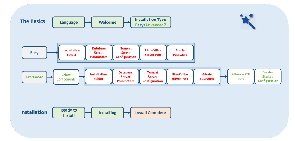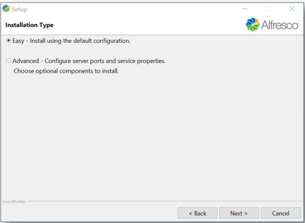- Easy: Install Alfresco using default configuration settings.