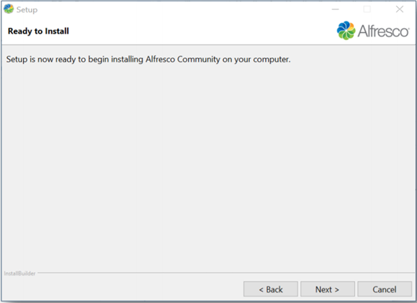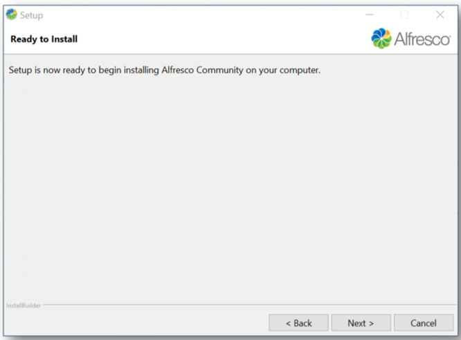 - Ready to Install: Setup is now ready to begin installing Alfresco.