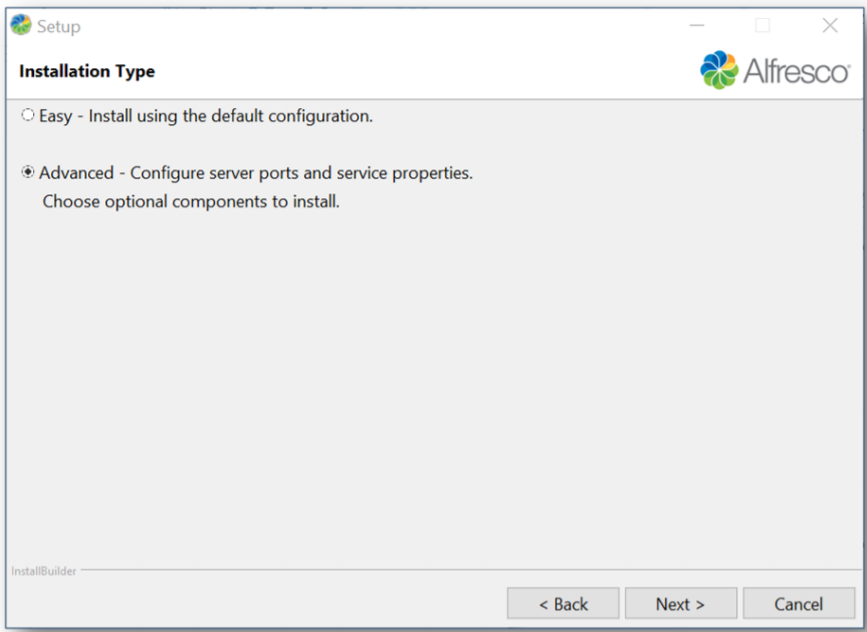 - Advanced: Manually select server port numbers, service properties and third-party components before installing Alfresco.