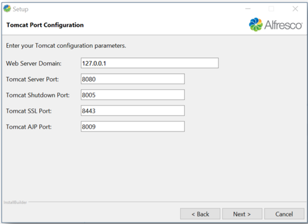 - Database Server Port: Enter the port number of the database Alfresco will use.