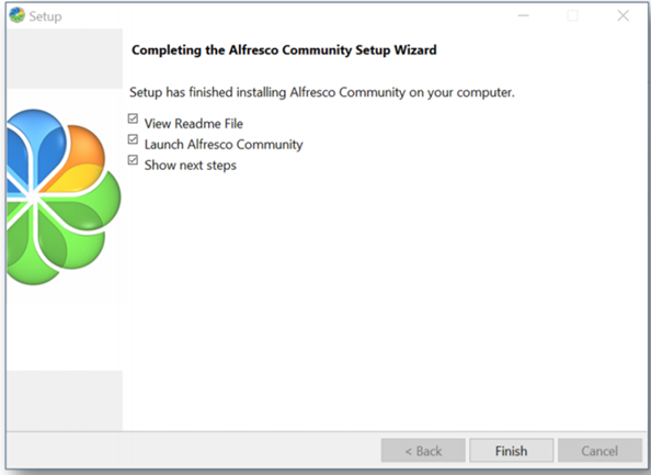 The Completing the Alfresco Community Setup Wizard screen allows you to close the Alfresco Community Setup Wizard.