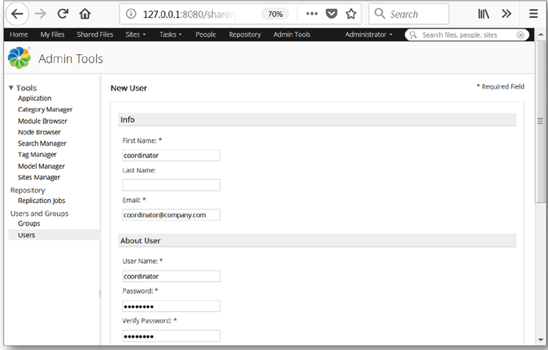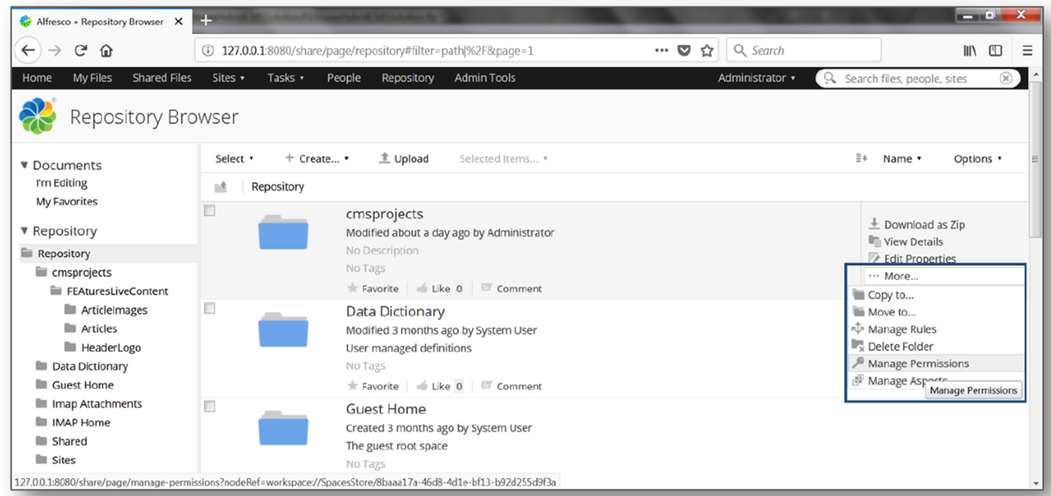 - Select Create User and after confirmation that the coordinator user has been created, select the Repository tab. With the folder cmsprojects highlighted, click More then select Manage Permissions.