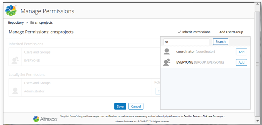 The following pages show how to set permissions for the ‘admin’ user on the folder /cmisprojects and to add a new user called ‘coordinator’. You will then be able to login to Live CMS with these user names and create and publish Live CMS articles.