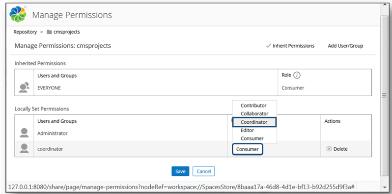 - Click on the default Consumer role and select Contributor from the list. This will ensure that the admin user in Live CMS has all the required actions to create content for Live CMS will be supported in Alfresco.