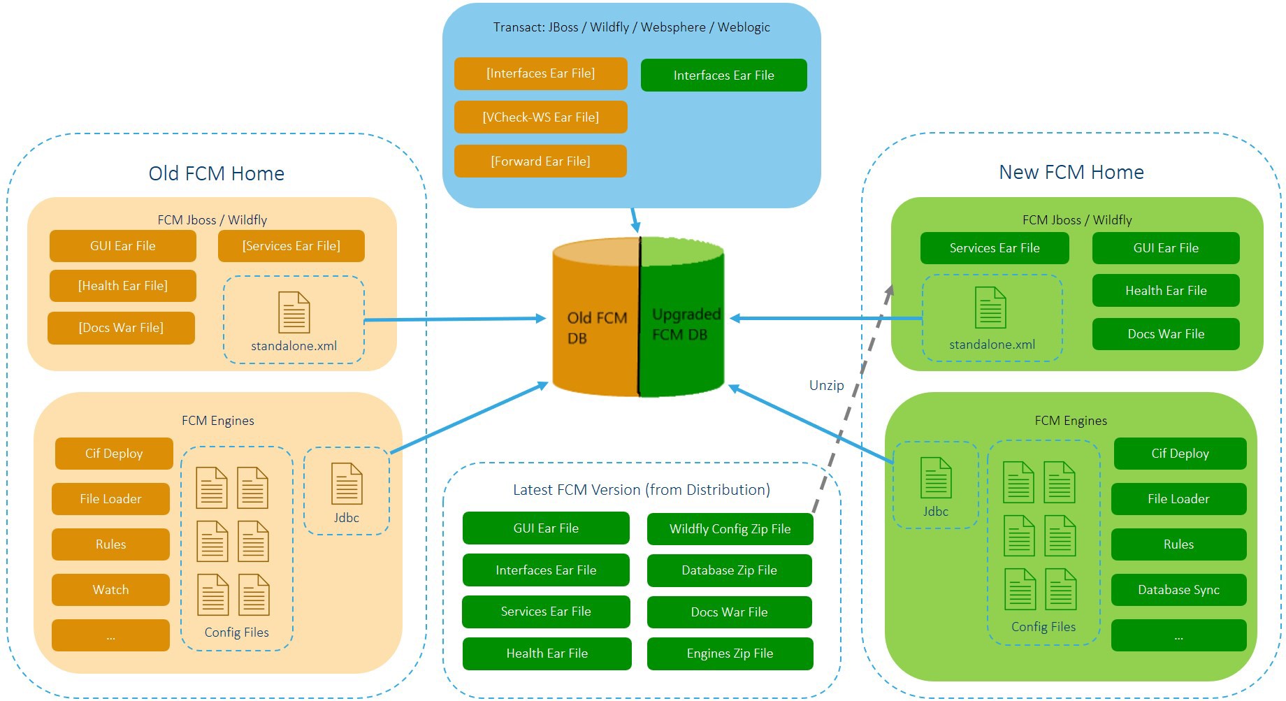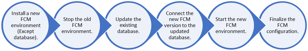 When updating from an older version of FCM to the latest version, three primary activities take place: backing up your complete database and engines, upgrading your database, and installing latest FCM on a new system. The newly installed FCM version can connect to the upgraded database. The architecture diagram below helps you to understand the upgrade process.