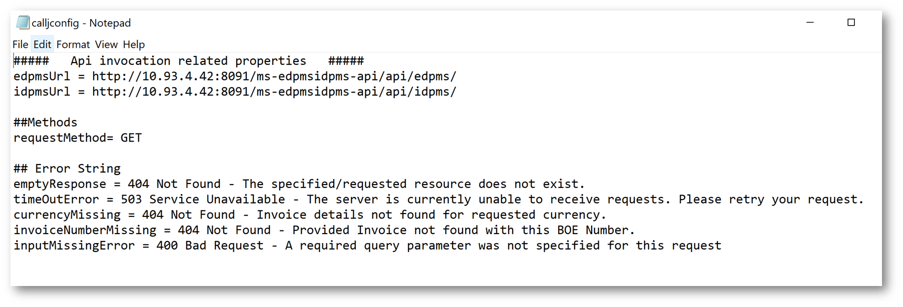 - Open the calljcofig.properties file in the InlendInvokeRegulatoryApi.jar.