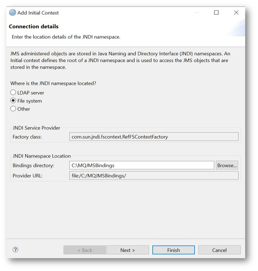 - To create the default bindings file, right-click on JMS Administered Objects, select Add Initial Context.