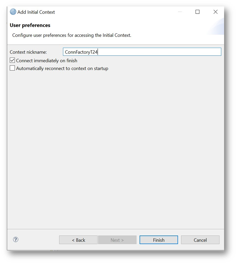 - Give a nickname for the connection factory and click on the Finish button.