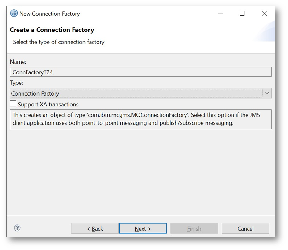 - Ensure that the Type is Connection Factory. Click on the Next button.