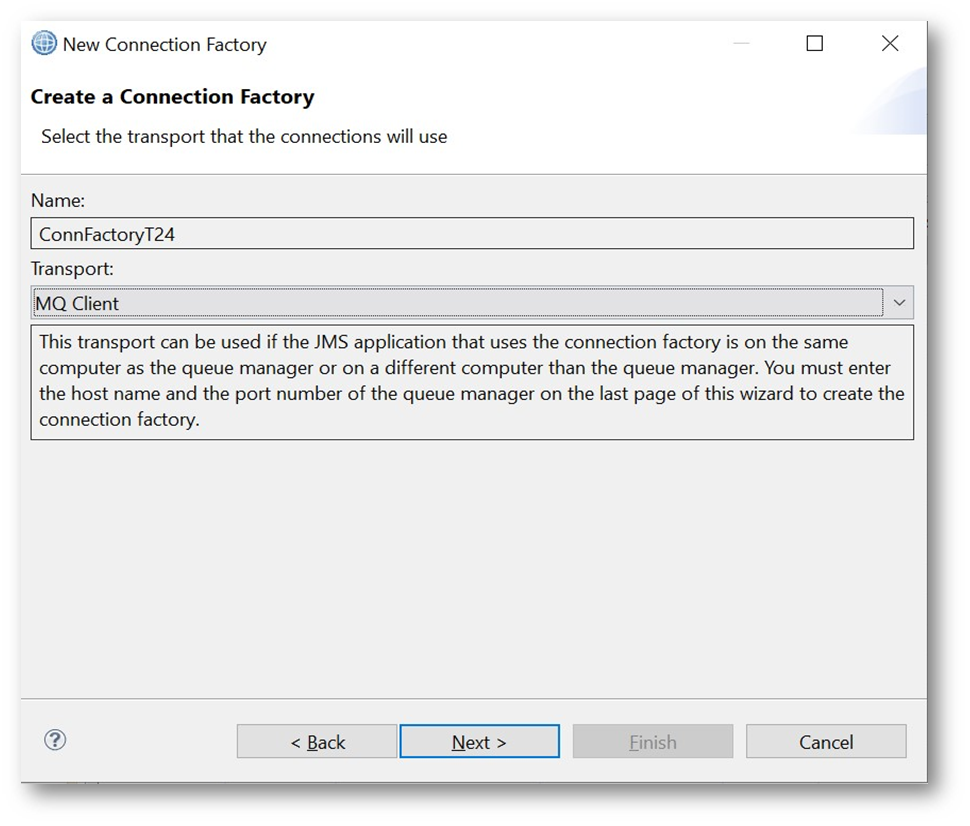 - Ensure that the Transport is MQ Client. Click on the Next button.