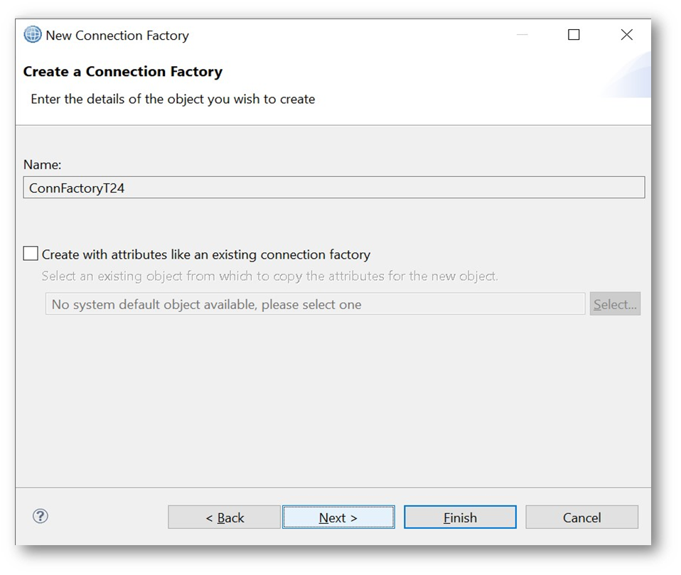 - Give the connection factory name. Can be the same or different from the nickname. Click on the Next button.