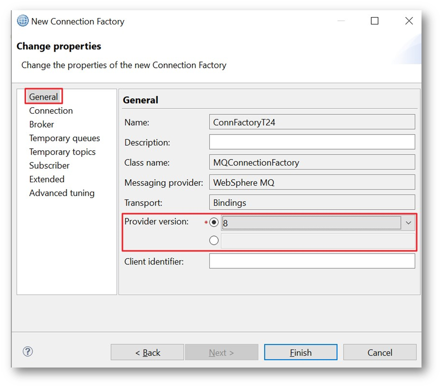 - Give the Provider version in the General tab, for example, MQ version.