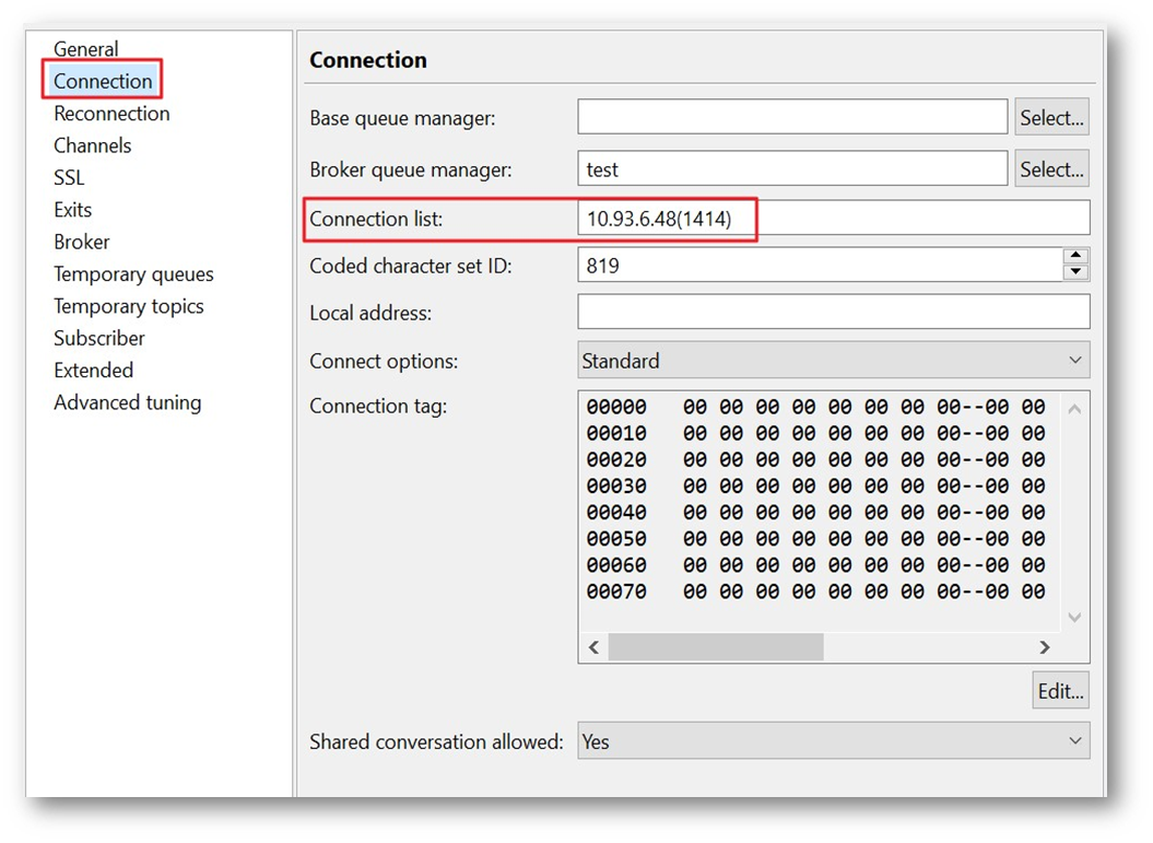 - For the IBM MQ Server IP and port, in the Connection tab, in the Connection list field, input the server IP and listener port in parenthesis, as per below.