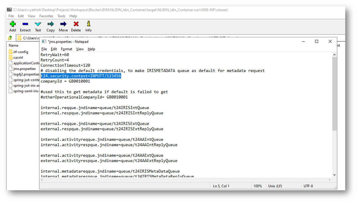 - Uncomment the t24.security.context property in the jms.properties file available in the war file.