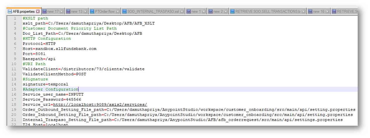 - Create the property file for the fix interface listing the Temenos Transact adapter configuration, AFB API path and xslt path.