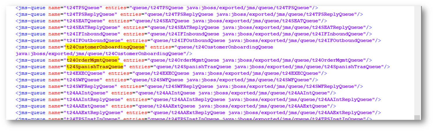 <jms-queue name="t24CustomerOnboardingQueue" entries="queue/t24CustomerOnboardingQueue java:jboss/exported/jms/queue/t24CustomerOnboardingQueue"/>