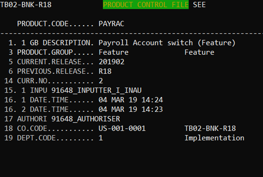 Product (here, PAYRAC) specified in EB.PRODUCT gets updated. The current and previous release details are also updated.