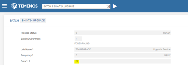 - In the BATCH record of BNK/T24.UPGRADE, specify the product name in the DATA field and ensure that the BATCH.STAGE field is empty.