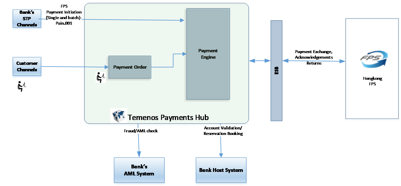 | ESB | Enables interface gateway of Temenos payment system to interact with HK FPS clearing. The payment system interacts with the following: