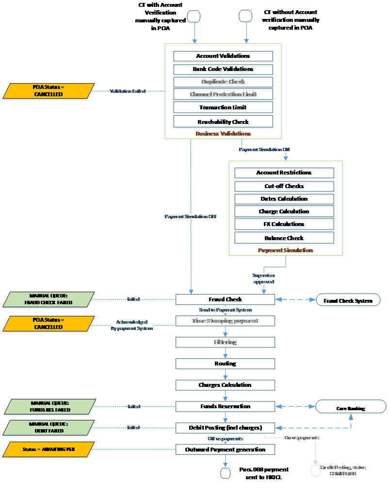 | Routing | Routes the payment to a clearing channel (HK FPS), which moves it to HK FPS (through IIB). The clearing channel is involved in determining the message type (HK FPS pacs.008). |