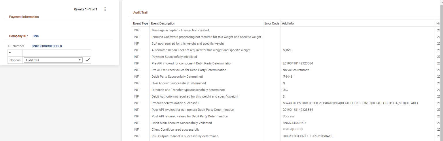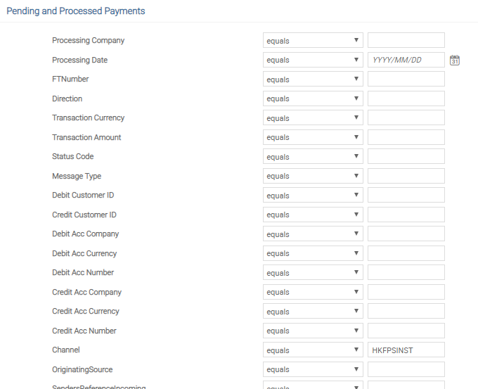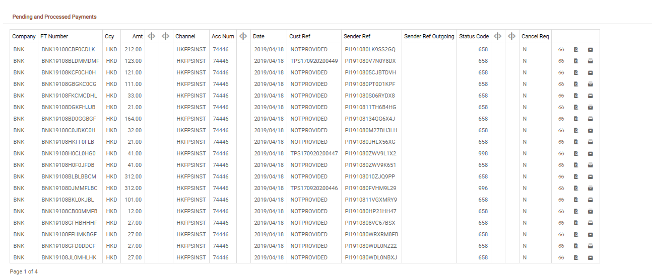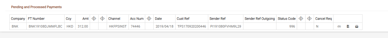 - To view the return payment in the existing Pending and Processed Payments page, search for the Channel as HKFPSINST and Status Code as 996.