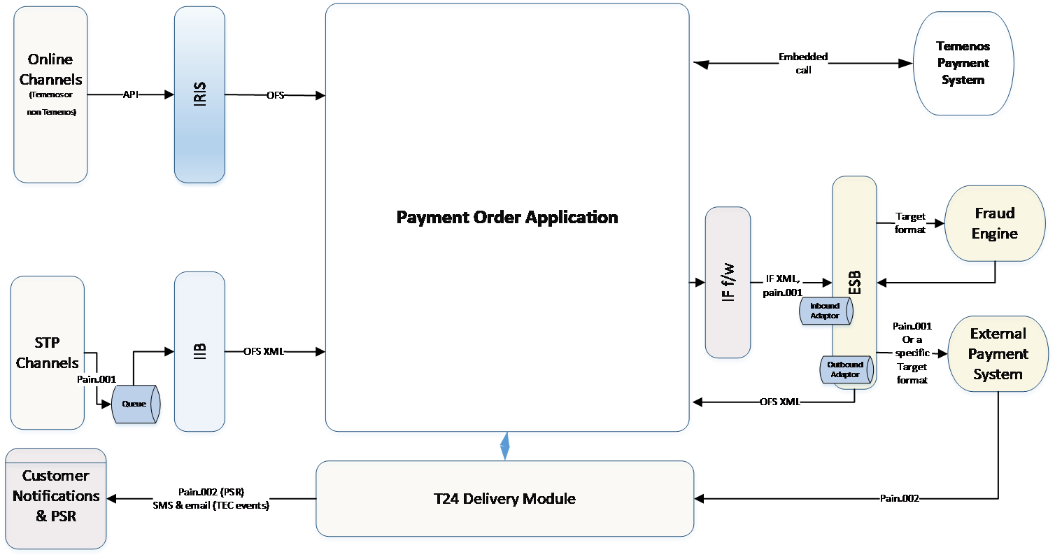 APIs are hosted in Temenos Interaction Framework (IRIS) for third-party applications to call-in. API based communication is synchronous from calling programs point of view. IRIS internally uses Open Financial Service (OFS) to communicate with PO application. This interface is internal to Temenos Transact and irrelevant to calling application. PO application exposed (using IRIS) several APIs for payment initiation, enquiry, and other functionalities.
