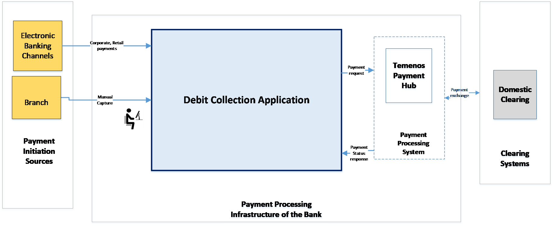 | Debit Collection Application | Receives (using standard Temenos Transact interface), validates, and routes the request to Temenos Payments. |