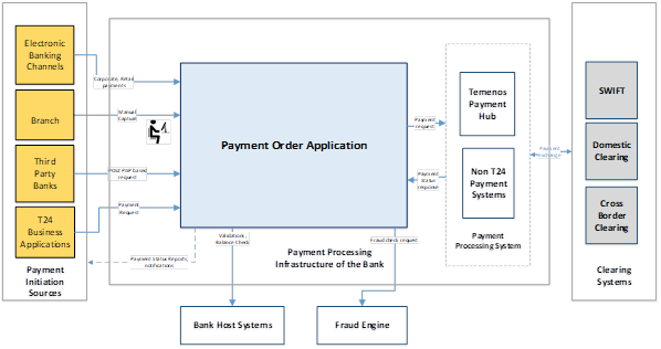 The payment processing system (such as TPH or bank’s non-Temenos Payment system) validates, books and routes the payment to an appropriate clearing system. Payment instruction exchanges are in embedded mode when PO application operates with TPH, whereas, uses the standard message formats and interfaces in an external system. In-house payment requests are settled within the bank’s core banking, instead of sending it to clearing.