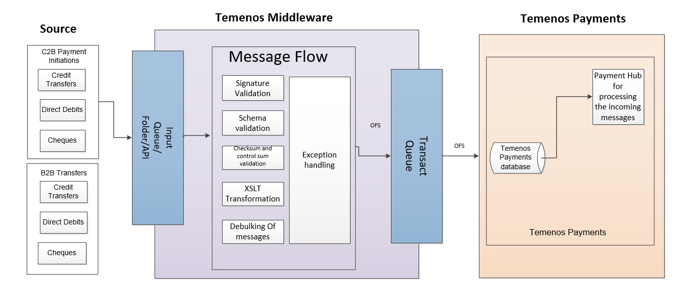 Debulks the message into individual transactions for posting to Temenos Payments for processing