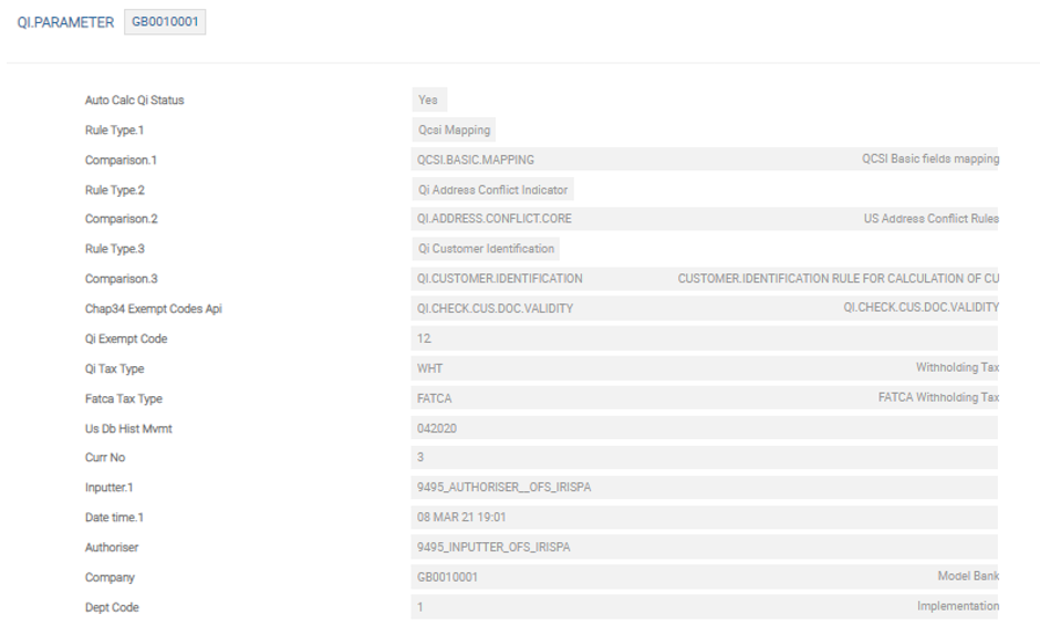 The module level parameter, that is, QI.PARAMETER, holds the bank’s user-defined parametric values and are referred to by the three key features of the QI module in delivering the QI functionality.