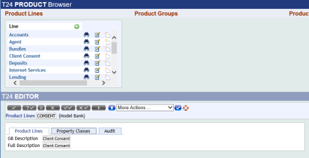The application allows the user to construct banking products by combining different business components. PRODUCT.LINES provides functionality for different banking areas, which are licensed by Temenos. Each product line uses a number of property classes (business components) that can be fully configured.